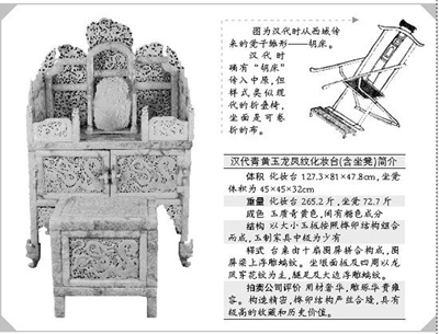 在百度貼吧和新浪微博,網(wǎng)民都在熱議“漢代的凳子”。 記者調(diào)查得知,關(guān)于這把“漢代凳子”,多家媒體曾正兒八經(jīng)地報道過:在北京中嘉國際拍賣有限公司舉辦的“2011年古代玉器專場拍賣會”上,“漢代青黃玉龍鳳紋化妝臺(含坐凳)”以1.8億元起拍,最終以2.2億元成交。 據(jù)悉,它創(chuàng)下新的玉器拍賣紀錄,同時它也是2011年中國藝術(shù)品拍賣市場的最貴玉器。 記者隨后登錄中嘉拍賣公司網(wǎng)站查詢,很快找到了關(guān)于這套拍品的記錄,與上述情況完全相符。 這套玉器,被拍賣公司說成是一套“讓今人看后嘆為觀止,具有極高的收藏和歷史價值”的文物珍品。但它被很多網(wǎng)民嘲笑為“作假不專業(yè)”:大家紛紛指出,按照一般的歷史常識,漢代古人都是“席地而坐”的,當(dāng)時還沒發(fā)明凳子! 隨后,記者查詢了大量資料。按照通說,凳子的最初形態(tài)為西域的“胡床”,而后演變?yōu)榈首,隋唐時期逐漸盛行。 漢代古人皆習(xí)慣席地而坐。漢代時確有“胡床”傳入中原,但樣式與被拍賣的“天價玉凳”大相徑庭。