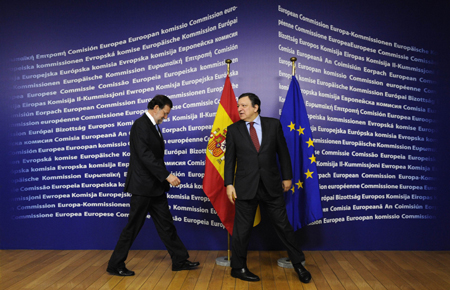 圖為2012年1月30日,在布魯塞爾歐盟總部,西班牙首相拉霍伊和歐盟委員會(huì)主席巴羅佐(右)與媒體見面。