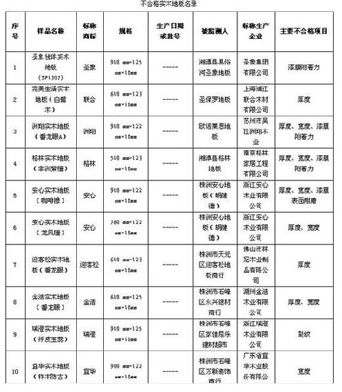 本次實(shí)木地板抽樣檢測(cè),從長(zhǎng)沙、湘潭、株洲3市的26家經(jīng)銷(xiāo)單位抽取了28個(gè)品種的實(shí)木地板產(chǎn)品。經(jīng)檢測(cè),合格16組,不合格11組,合格率為59.25%。11組不合格的樣品中,存在的主要問(wèn)題是厚度、寬度、漆膜附著力三項(xiàng)指標(biāo)不合格。