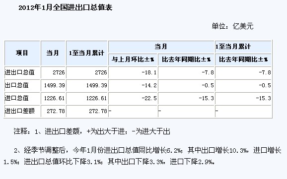 海關(guān)總署10日公布今年首月我國外貿(mào)進(jìn)出口情況。據(jù)海關(guān)統(tǒng)計(jì),2012年1月份,我國對(duì)外貿(mào)易進(jìn)出口總值2726億美元,比去年同期(下同)下降7.8%。其中出口1499.4億美元,下降0.5%;進(jìn)口1226.6億美元,下降15.3%。貿(mào)易順差272.8億美元。
