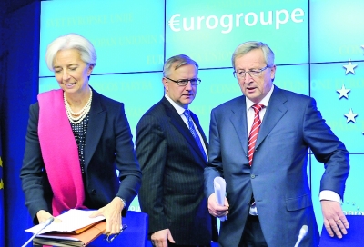 2月21日,在比利時首都布魯塞爾的歐盟總部,國際貨幣基金組織總裁拉加德、歐盟委員會負責經(jīng)濟與貨幣事務的委員雷恩和歐元集團主席、盧森堡首相容克(左至右)出席歐元區(qū)財長會議后的記者招待會。