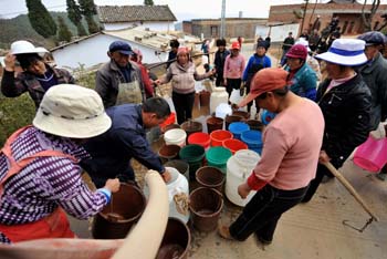 看著僅有的一點水,老母村委會黨總支書記張海生滿臉愁容。他說:“這口井有上百年歷史了,是全村700多村民和旁邊小學(xué)近兩百名師生的飲水源泉。歷史上從來沒有干涸過,前年特大干旱也沒有。去年9月以來,我們這里一直沒有下過雨,這口百年老井里的水越來越少,2月以來一天比一天少,現(xiàn)在已經(jīng)見底了!睘榱私鉀Q飲水難題,老母村委會組織每天組織村民和學(xué)生附近幾公里外的地方拉水來喝。張海生說:“拉水的地方是個小壩塘,水量很少,最多能再維持一個星期!