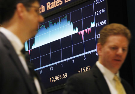 當(dāng)日,由于歐元區(qū)財(cái)長(zhǎng)通過(guò)第二輪希臘救助協(xié)議,道瓊斯30種工業(yè)股票平均價(jià)格指數(shù)數(shù)次突破13000點(diǎn)大關(guān)。這是道指自2008年5月以來(lái)首次突破13000點(diǎn)大關(guān)。不過(guò),每次突破僅維持?jǐn)?shù)十秒,當(dāng)天道指收盤時(shí)也失守這一關(guān)口,報(bào)12965.69點(diǎn),全天上漲15.82點(diǎn)。