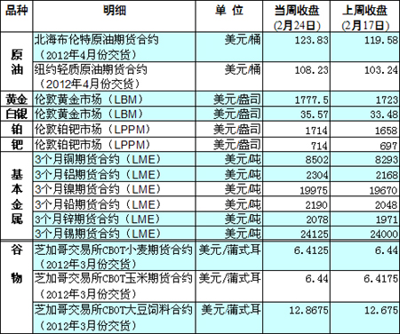 國(guó)際大宗商品期貨價(jià)格明細(xì)表[2012-02-27]