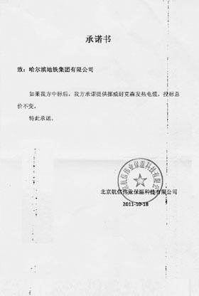 這個(gè)補(bǔ)救辦法就是寫一份《承諾書》。記者拿到了這份印有“北京航信偉業(yè)保溫科技有限公司”公章,由航信偉業(yè)向哈爾濱地鐵集團(tuán)公司出具的《承諾書》,《承諾書》稱:“如果我方中標(biāo)后,我方承諾提供挪威耐克森發(fā)熱電纜,投標(biāo)總價(jià)不變。”該《承諾書》的落款時(shí)間是2011年10月18日,即中標(biāo)公告發(fā)布前一天。