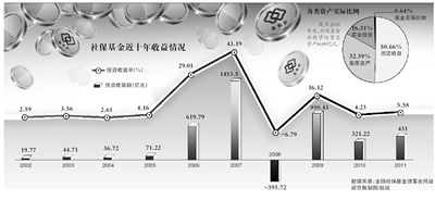 戴相龍昨日在會議上透露,截至2011年底,社;饡顿Y運營總資產(chǎn)8689億元,其中,直接投資資產(chǎn)為5042億元,占58.03%;委托投資資產(chǎn)為3647億元,占41.97%。到2011年底,各大類資產(chǎn)的實際比例分別為:固定收益占50.66%,股票資產(chǎn)占32.39%,實業(yè)投資占16.31%,現(xiàn)金及等價物占0.64%。 戴相龍稱,2011年基金投資已實現(xiàn)收益431億元,實現(xiàn)收益率5.58%。2010年,上證綜指去年整體跌14.31%,社;鹜顿Y收益321億元,投資收益率4.22%。 數(shù)據(jù)顯示,在2001年-2011年的11年里,全國社;鸸矊崿F(xiàn)投資收益2847億元,年均收益率為8.41%,比同期通脹率高出6個百分點。