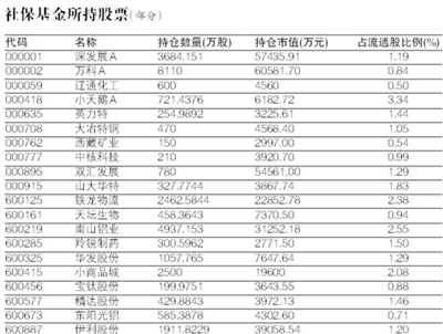 數(shù)據(jù)來源:Wind資訊(注:表中數(shù)據(jù)截止日期為2011年12月31日。截至去年三季度,社;鸸灿嬙365家公司的前十大流通股東名單中出現(xiàn)。) 全國社;鹄硎聲硎麻L戴相龍昨日表示,社保基金8年投資股票累計獲得投資收益1326億元,占全部投資收益的46%,年化投資收益率達到18.61%,比全部基金累計平均收益率高出10個多百分點。