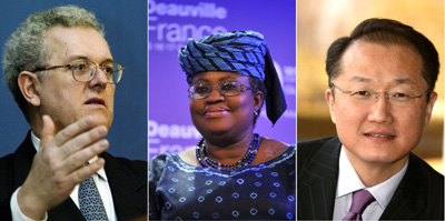 三位候選人分別是:韓裔美籍醫(yī)學專家、美國達特茅斯學院校長金辰勇,前世行常務副行長、尼日利亞財政部長奧孔喬·伊韋拉,前聯合國副秘書長、哥倫比亞前財政部長奧坎波。