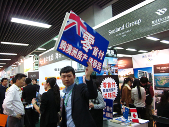 4月5日,為期四天的2012年北京春季房地產(chǎn)展示交易會在中國國際貿易中心開幕。本屆房展會有美國、加拿大、澳大利亞、新加坡、英國、泰國等超過30個國家和地區(qū)的130多個海外地產(chǎn)商參加。數(shù)百個項目類型涵蓋了住宅、公寓、別墅、土地交易和投資移民等。圖為一家澳洲房產(chǎn)展臺工作人員打出“零首付、送移民”的廣告牌吸引看房客。記者