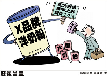 “一罐奶粉的成本不會超過100元,可是國內市場上‘洋奶粉’的零售價動輒三四百元,比境外貴一兩倍;還有一些打著‘洋奶粉’旗號的中國特供奶,價格也高得離譜,對消費者產(chǎn)生一定的誤導性。”一位專家抱怨,“洋奶粉”暴利已經(jīng)到了讓人難以置信的地步,但消費者對其肆無忌憚的連續(xù)漲價卻束手無策。 《經(jīng)濟參考報》記者了解到,進口奶粉量價齊增,一方面是需求增加,另一方面則是行業(yè)的暴利驅使更多企業(yè)進口奶粉。值得關注的是,進口奶粉與國產(chǎn)奶粉的競爭正在向中低端延伸。以前,進口奶粉主攻高端市場,現(xiàn)在各種中小品牌和雜牌“洋奶粉”也蜂擁而至,向中低端市場挺進,直接蠶食傳統(tǒng)的國產(chǎn)奶粉市場。