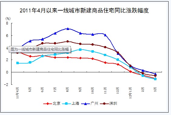 在新建商品住宅銷售價格同比下降的38個城市中,有19個城市的降幅比2月份還有所擴大。即使在新建商品住宅銷售價格同比上漲的29個城市中,21個城市的同比漲幅也比2月份有所回落。北京、上海、廣州、深圳等一線城市新建商品住宅銷售價格同比降幅進一步擴大,3月份比2月份分別擴大0.5個、0.5個、0.6個和0.4個百分點。房地產(chǎn)市場宏觀調(diào)控成效繼續(xù)顯現(xiàn)。
