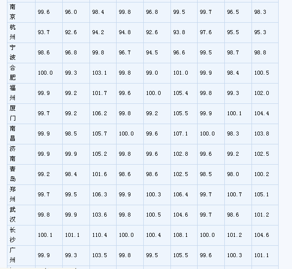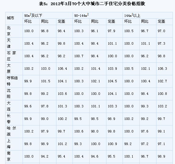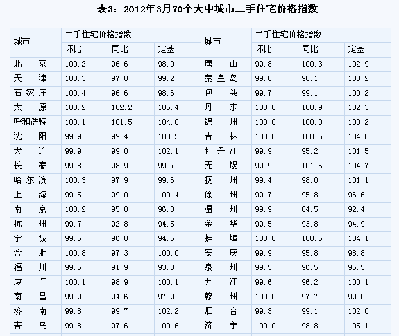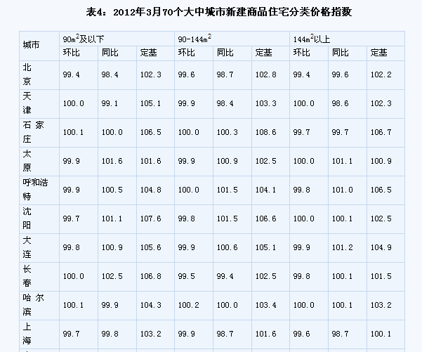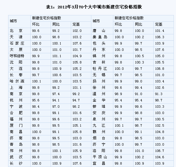 (一)與上月相比,70個(gè)大中城市中,價(jià)格下降的城市有42個(gè),持平的城市有12個(gè),上漲的城市有16個(gè)。環(huán)比價(jià)格上漲的城市中,漲幅均未超過0.8%。 (二)與去年同月相比,70個(gè)大中城市中,價(jià)格下降的城市有49個(gè),比2月份增加了5個(gè);持平的城市有1個(gè),上漲的城市有20個(gè)。3月份,同比漲幅比2月份回落的城市有15個(gè),漲幅均未超過3.3%。