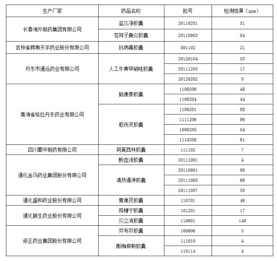 第一批檢驗(yàn)主要針對(duì)媒體曝光的9家藥品生產(chǎn)企業(yè),共抽驗(yàn)33個(gè)品種42個(gè)批次,其中23個(gè)批次不合格。檢驗(yàn)結(jié)果表明,長(zhǎng)春海外制藥集團(tuán)有限公司、青海格拉丹東藥業(yè)有限公司、丹東市通遠(yuǎn)藥業(yè)有限公司、吉林省輝南天宇藥業(yè)股份有限公司、四川蜀中制藥有限公司、修正藥業(yè)集團(tuán)股份有限公司、通化金馬藥業(yè)集團(tuán)股份有限公司、通化盛和藥業(yè)股份有限公司、通化頤生藥業(yè)股份有限公司等企業(yè)有的批次產(chǎn)品使用的膠囊鉻含量超過(guò)國(guó)家藥典限量標(biāo)準(zhǔn)。上述企業(yè)未按藥品生產(chǎn)質(zhì)量管理規(guī)范組織生產(chǎn),使用了不符合國(guó)家藥典標(biāo)準(zhǔn)的膠囊,產(chǎn)品質(zhì)量不合格。