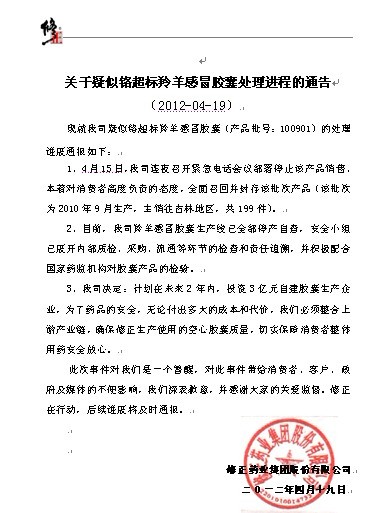 4月19日,修正藥業(yè)就公司疑似鉻超標(biāo)羚羊感冒膠囊(產(chǎn)品批號(hào):100901)的處理進(jìn)展發(fā)布通報(bào),表示對(duì)羚羊感冒膠囊生產(chǎn)線已全部停產(chǎn)自查,并積極配合國(guó)家藥監(jiān)機(jī)構(gòu)對(duì)膠囊產(chǎn)品的檢驗(yàn)。修正藥業(yè)表示,計(jì)劃在未來(lái)2年內(nèi),投資3億元自建膠囊生產(chǎn)企業(yè),切實(shí)保障消費(fèi)者整體用藥安全放心。通報(bào)全文附后。