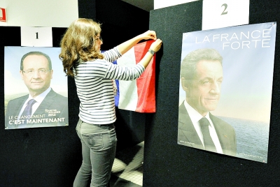法國總統(tǒng)選舉第二輪投票6日全面展開,現(xiàn)任總統(tǒng)薩科齊和左翼社會黨候選人奧朗德為下一屆總統(tǒng)職位展開最后角逐。法國本土投票站最晚于當(dāng)晚20時(北京時間7日凌晨2時)關(guān)閉,據(jù)悉此后不久即公布初步統(tǒng)計結(jié)果。 奧朗德主張尋求變革,回應(yīng)選民有關(guān)失業(yè)、購買力、安全等一系列問題的擔(dān)憂,并承諾將引導(dǎo)歐洲重返加速增長和擴大就業(yè)的道路。而代表右翼保守勢力的薩科齊主打緊縮、增稅和保護(hù)主義牌。 圖為一名工作人員在澳大利亞悉尼市法語聯(lián)盟語言學(xué)校中設(shè)立的海外投票站點布置會場。