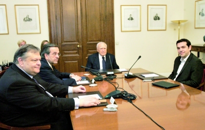 5月13日,希臘總統(tǒng)卡羅洛斯·帕普利亞斯(右二)在雅典會(huì)見泛希社運(yùn)領(lǐng)導(dǎo)人埃萬(wàn)耶洛斯·韋尼澤洛斯(左一)、新民主黨領(lǐng)導(dǎo)人安東尼斯·薩馬拉斯(左二)和左翼激進(jìn)聯(lián)盟黨領(lǐng)導(dǎo)人亞歷克西斯·齊普拉斯(右一)。 希臘議會(huì)第三大政黨泛希臘社會(huì)主義運(yùn)動(dòng)、即泛希社運(yùn)12日交還總統(tǒng)帕普利亞斯的授權(quán),放棄組閣嘗試。帕普利亞斯于13日中午召集所有政黨領(lǐng)導(dǎo)人,以求就組閣達(dá)成一致。據(jù)外媒報(bào)道,薩馬拉斯稱,左翼激進(jìn)聯(lián)盟黨反對(duì)組建聯(lián)合政府,重新選舉難以避免。新華社發(fā)