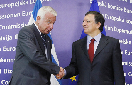 圖為歐盟主席巴羅佐23日歡迎希臘看守總理皮克拉門(mén)諾斯參加本次峰會(huì)。