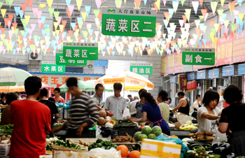 6月9日,市民在山西太原市大營盤菜市場選購食品。當(dāng)日,國家統(tǒng)計局發(fā)布報告,5月份全國居民消費價格總水平(CPI)同比上漲3%。新華社記者