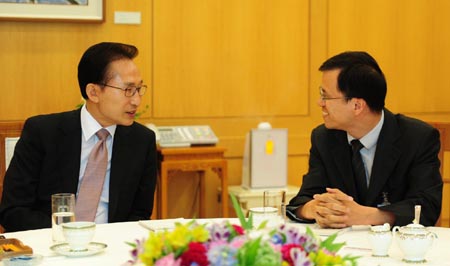 《經(jīng)濟參考報》記者13日上午與韓國《每日經(jīng)濟新聞》等5家媒體在韓國總統(tǒng)府青瓦臺聯(lián)合采訪了韓國總統(tǒng)李明博。李明博指出,中韓建交短短20年,兩國關系發(fā)展速度之快、合作之強前所未有。韓國政府愿積極推動韓中日自由貿易協(xié)定(FTA),希望在世界經(jīng)濟面臨困難時,對主要國家經(jīng)濟發(fā)揮積極的作用。