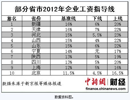 中新網財經頻道統(tǒng)計發(fā)現(xiàn),截至6月19日,目前全國已有10個省份發(fā)布了2012年的企業(yè)工資指導線。其基準線大多在14%左右,其中新疆和天津基準線最高,達16%,北京基準線最低,為11.5%。