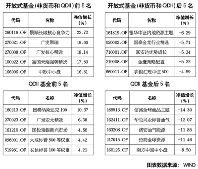 從具體基金產(chǎn)品來看,在普通股票型基金中,景順長城核心競爭力(22.72%)、廣發(fā)聚瑞(19.66%)、廣發(fā)核心精選(18.14%)業(yè)績位居前三;在指數(shù)型基金中國投瑞銀滬深300金融(9.87%)、富國中證500(9.66%)、博時(shí)超大盤ETF(9.04%)位居前三;混合型基金中富國天瑞強(qiáng)勢精選(17.50%)、中銀收益(15.65%)、交銀主題優(yōu)選(12.98%)表現(xiàn)最好;萬家添利分級(13.77%)、天治穩(wěn)健雙盈(12.96%)、南方廣利回報(bào)AB(10.96%)位居全部債券型基金業(yè)績前三。
