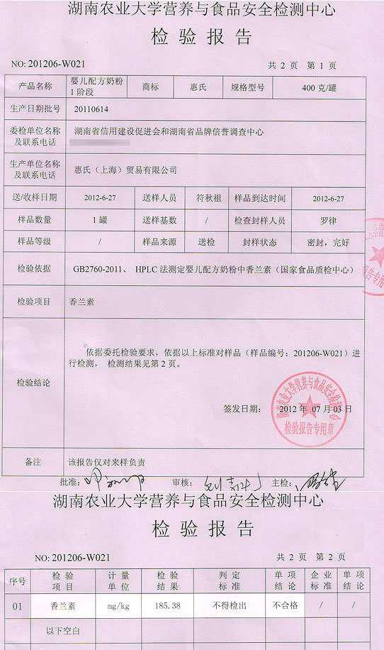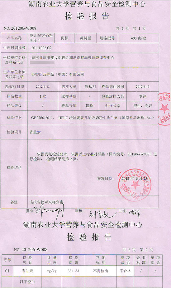 經(jīng)檢測(cè),標(biāo)注“美贊臣營(yíng)養(yǎng)品(中國(guó))有限公司”生產(chǎn)的生產(chǎn)日期為“20111022B2”、批號(hào)為“0028887CH1KNW5B”盒裝嬰兒配方奶粉(1階段)和生產(chǎn)日期為“20120418”、批號(hào)為“0057427CH2DJN5C”灌裝嬰兒配方奶粉(1階段)兩種型號(hào)的產(chǎn)品因含有香蘭素被判不合格。雅培、惠氏等洋品牌的1階段嬰兒配方奶粉均檢測(cè)出香蘭素,被判不合格。根據(jù)《食品安全國(guó)家標(biāo)準(zhǔn)食品添加劑使用規(guī)定》GB2760—2011要求,凡使用范圍涵蓋0至6個(gè)月嬰幼兒配方食品不得添加任何食用香料。