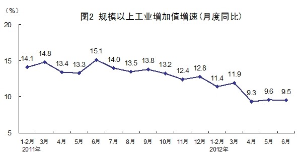 上半年,全國規(guī)模以上工業(yè)增加值按可比價格計算同比增長10.5%,增速比一季度回落1.1個百分點,比上年同期回落3.8個百分點。分經(jīng)濟(jì)類型看,國有及國有控股企業(yè)增加值同比增長7.0%,集體企業(yè)增長8.0%,股份制企業(yè)增長12.4%,外商及港澳臺商投資企業(yè)增長6.3%。分輕重工業(yè)看,重工業(yè)增加值同比增長10.1%,輕工業(yè)增長11.1%。分行業(yè)看,41個大類行業(yè)中有40個行業(yè)增加值同比增長。分地區(qū)看,東部地區(qū)增加值同比增長8.9%,中部地區(qū)增長12.9%,西部地區(qū)增長13.2%。分產(chǎn)品看,上半年471種產(chǎn)品中有332種產(chǎn)品產(chǎn)量同比增長。其中,發(fā)電量增長3.7%,鋼材增長6.1%,水泥增長5.5%,十種有色金屬增長6.7%,乙烯下降3.3%,汽車增長6.7%,其中轎車增長7.5%。上半年,全國規(guī)模以上工業(yè)企業(yè)產(chǎn)銷率達(dá)到97.5%,同比下降0.6個百分點。規(guī)模以上工業(yè)企業(yè)實現(xiàn)出口交貨值50505億元,同比增長7.1%。6月份,規(guī)模以上工業(yè)增加值同比增長9.5%,環(huán)比增長0.76%。