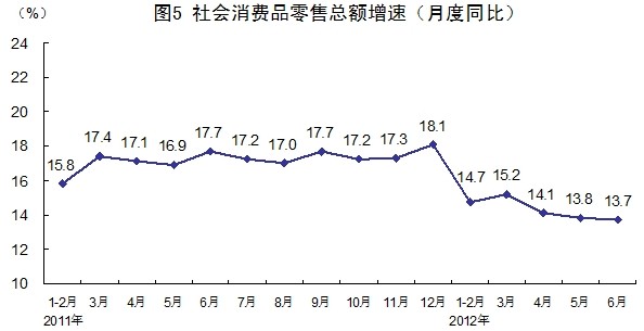 上半年,社會消費(fèi)品零售總額98222億元,同比名義增長14.4%(扣除價格因素實際增長11.2%),增速比一季度回落0.4個百分點,比上年同期回落2.4個百分點。其中,限額以上企業(yè)(單位)消費(fèi)品零售額46592億元,同比增長14.9%。按經(jīng)營單位所在地分,城鎮(zhèn)消費(fèi)品零售額85123億元,同比增長14.3%;鄉(xiāng)村消費(fèi)品零售額13099億元,增長14.5%。按消費(fèi)形態(tài)分,餐飲收入10837億元,同比增長13.2%;商品零售87385億元,增長14.5%。在商品零售中,限額以上企業(yè)(單位)商品零售額43065億元,同比增長15.0%。其中,汽車類增長9.1%,家具類增長25.1%,家用電器和音像器材類增長3.3%。6月份,社會消費(fèi)品零售總額同比名義增長13.7%(扣除價格因素實際增長12.1%),環(huán)比增長1.08%。