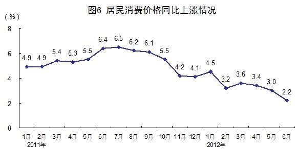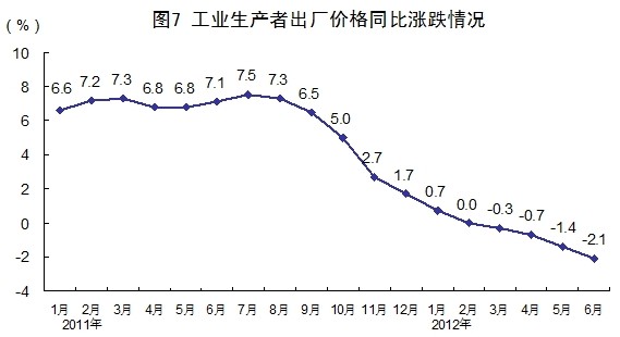 上半年,居民消費(fèi)價格同比上漲3.3%,漲幅比一季度回落0.5個百分點,比上年同期回落2.1個百分點。其中,城市上漲3.3%,農(nóng)村上漲3.3%。分類別看,食品同比上漲6.9%,煙酒及用品上漲3.5%,衣著上漲3.5%,家庭設(shè)備用品及維修服務(wù)上漲2.2%,醫(yī)療保健和個人用品上漲2.4%,娛樂教育文化用品及服務(wù)上漲0.2%,居住上漲1.8%,交通和通信同比持平。6月份,居民消費(fèi)價格同比上漲2.2%,環(huán)比下降0.6%。上半年,工業(yè)生產(chǎn)者出廠價格同比下降0.6%,一季度和上年同期分別為上漲0.1%和7.0%;其中6月份同比下降2.1%,環(huán)比下降0.7%。上半年,工業(yè)生產(chǎn)者購進(jìn)價格同比下降0.3%;其中6月份同比下降2.5%,環(huán)比下降0.8%。