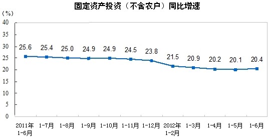 2012年1-6月份,全國固定資產(chǎn)投資(不含農(nóng)戶)150710億元,同比增長20.4%(扣除價格因素實際增長18.0%),增速較1-5月份提高0.3個百分點。從環(huán)比看,6月份固定資產(chǎn)投資(不含農(nóng)戶)增長1.71%。