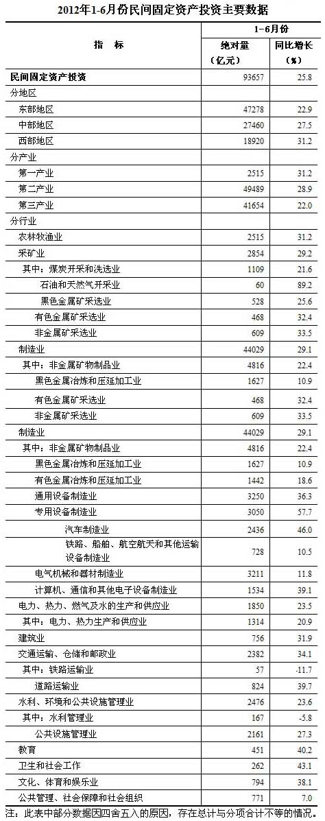 2012年1-6月份,全國民間固定資產(chǎn)投資93657億元,同比名義增長25.8%(扣除價格因素實際增長23.3%),增速比1-5月份回落0.9個百分點。民間固定資產(chǎn)投資占固定資產(chǎn)投資的比重為62.1%,比1-5月份回落0.1個百分點。