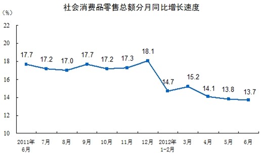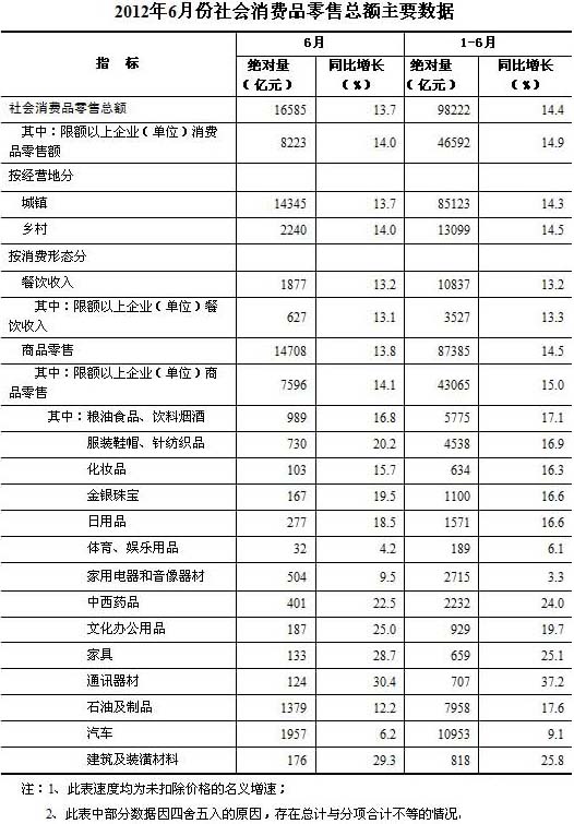 2012年6月份,全國社會消費品零售總額16585億元,同比名義增長13.7%(扣除價格因素實際增長12.1%,以下除特殊說明外均為名義增長)。其中,限額以上企業(yè)(單位)消費品零售額8223億元,增長14%。1-6月份,社會消費品零售總額98222億元,同比名義增長14.4%(扣除價格因素實際增長11.2%)。從環(huán)比看,6月份社會消費品零售總額增長1.08%。