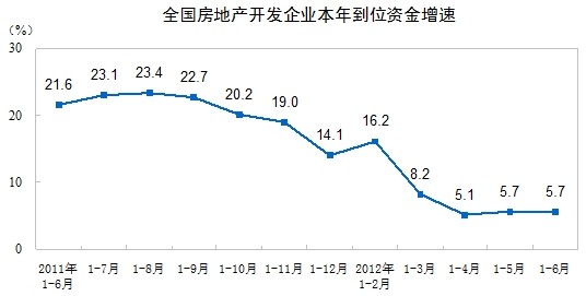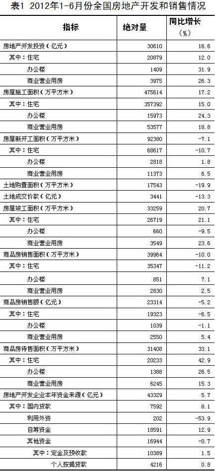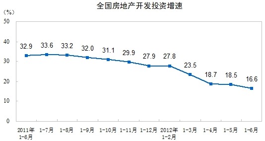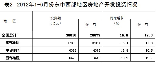 2012年1-6月份,全國房地產(chǎn)開發(fā)投資30610億元,同比名義增長16.6%(扣除價(jià)格因素實(shí)際增長14.3%),增速比1-5月份回落1.9個(gè)百分點(diǎn)。其中,住宅投資20879億元,增長12.0%,增速回落1.6個(gè)百分點(diǎn),占房地產(chǎn)開發(fā)投資的比重為68.2%。