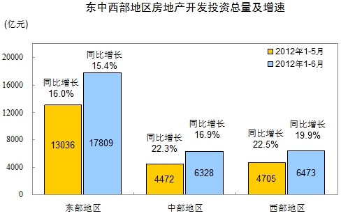 1-6月份,東部地區(qū)房地產(chǎn)開發(fā)投資17809億元,同比增長15.4%,增速比1-5月份回落0.6個(gè)百分點(diǎn);中部地區(qū)房地產(chǎn)開發(fā)投資6328億元,增長16.9%,增速回落5.4個(gè)百分點(diǎn);西部地區(qū)房地產(chǎn)開發(fā)投資6473億元,增長19.9%,增速回落2.6個(gè)百分點(diǎn)。