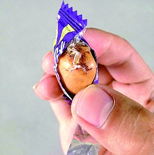 時隔一星期,昨天,超市營運部負責人王女士給出說法:“我們事發(fā)后已和廠商聯系,他們說因怡口蓮是漿液型糖果,進過高溫,按說不會有這樣的情況,應該是里面的果仁有蟲卵的殘留,我們也是第一次遇到!