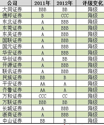 AA級券商中有14家等級維持不變,A級券商中12家等級得以保持。總的來看,2012年A級券商較上年減少5家至19家,AA級券商則減少1家至15家。