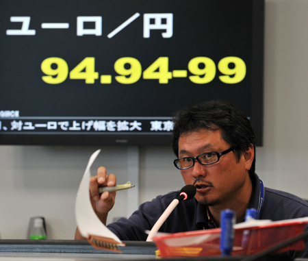 圖為7月23日,日本外匯市場(chǎng)的一名交易員在工作。