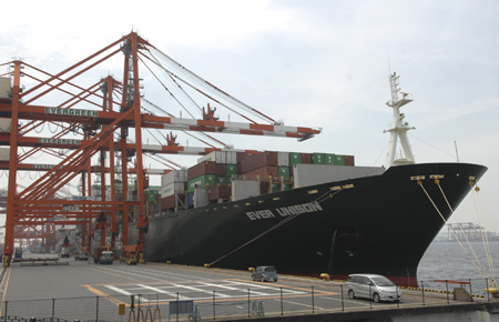 7月25日,一艘貨輪?吭谌毡緰|京大井集裝箱碼頭。 日本財務(wù)省25日公布的速報數(shù)據(jù)顯示,今年上半年日本出現(xiàn)2.9158萬億日元(約合373億美元)貿(mào)易逆差,創(chuàng)有統(tǒng)計以來半年期貿(mào)易逆差新高。