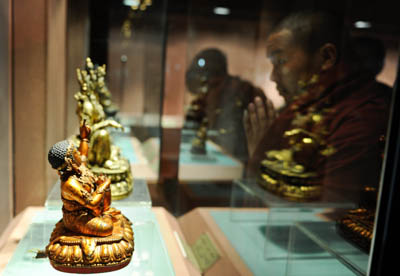 圖為一名僧人在觀看海外回流西藏文物展上展出的精美佛像。