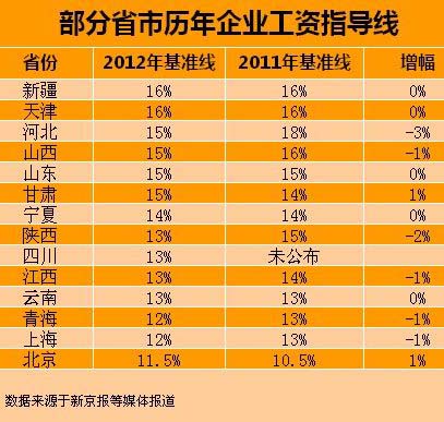 在這14個(gè)省(自治區(qū)、直轄市)中,新疆和天津基準(zhǔn)線最高,均為16%,北京最低,為11.5%。與2011年基準(zhǔn)線相比,河北、陜西、山西、青海、上海、江西這6個(gè)省份基準(zhǔn)線下調(diào),天津、新疆、山東、寧夏、云南這5個(gè)省份基準(zhǔn)線“零增長(zhǎng)”,只有北京和甘肅的基準(zhǔn)線較去年上漲,上漲幅度為1%。