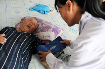 黑龍江省鶴崗市蘿北縣2009年被確定為黑龍江省首批基層醫(yī)藥衛(wèi)生體制綜合改革試點(diǎn)縣之一,醫(yī)改三年以來,切實(shí)減輕了老百姓的“藥擔(dān)子”,加上鄉(xiāng)鎮(zhèn)鄉(xiāng)村一體化管理,醫(yī)生定期回訪、為村民體檢,暖了鄉(xiāng)鎮(zhèn)老百姓的“心窩子”。 圖為蘿北縣團(tuán)結(jié)鎮(zhèn)紅衛(wèi)村衛(wèi)生所醫(yī)生李明晶(右)在為一位村民進(jìn)行血壓測量并詢問近期身體情況。記者