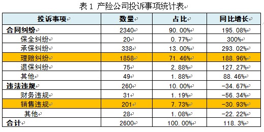 2012年上半年,消費(fèi)者投訴事項(xiàng)涉及產(chǎn)險(xiǎn)公司的共有2600個(gè),同比增長118.3%。其中,合同糾紛類投訴2340個(gè),占90%,同比增長195.08%;違法違規(guī)類投訴260個(gè),占10%,同比下降34.67%。