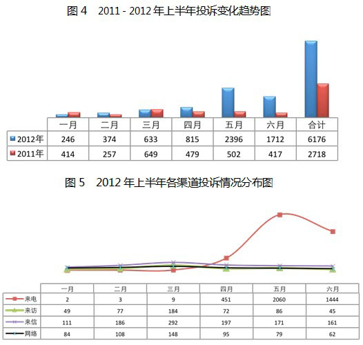 2012年上半年,保監(jiān)會共接收保險(xiǎn)消費(fèi)者有效投訴件6176件,同比增長127.23%,反映有效投訴事項(xiàng)共6651個(gè),同比增長129.42%。其中:信件投訴1118件,占投訴總量的18.10%,同比下降8.51%;網(wǎng)絡(luò)投訴576件,占9.33%,同比下降25.58%;來訪投訴513件,占8.31%,同比下降18.18%;電話投訴3969件,占64.26%,與去年同期相比增加3874件。另外,保監(jiān)會機(jī)關(guān)共接收保險(xiǎn)消費(fèi)者提出的信訪復(fù)查申請8件。
