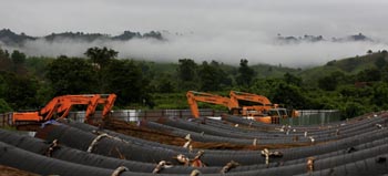 集結(jié)在若開山腳下的施工設(shè)備和彎管。資料照片 |