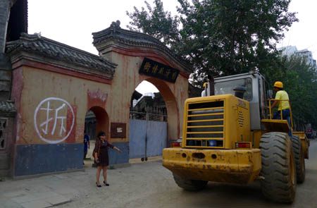 圖為北京電影制片廠明清風(fēng)情街大門(mén)旁的圍墻上寫(xiě)著“拆”字,一輛鏟車從門(mén)前經(jīng)過(guò)。