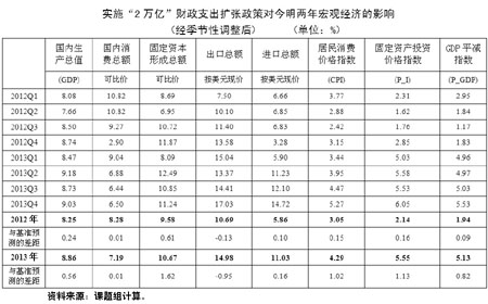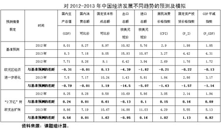 1、在各種預(yù)測(cè)及模擬情況下,經(jīng)濟(jì)增長(zhǎng)率的最低預(yù)測(cè)值為7.5%。說(shuō)明中國(guó)經(jīng)濟(jì)增長(zhǎng)“降中趨穩(wěn)”的態(tài)勢(shì)正在確立。盡管由于歐元區(qū)經(jīng)濟(jì)衰退的沖擊,將增大短期內(nèi)中國(guó)經(jīng)濟(jì)增長(zhǎng)率進(jìn)一步下滑的壓力,但是,適當(dāng)?shù)暮暧^調(diào)控政策將使中國(guó)經(jīng)濟(jì)不會(huì)出現(xiàn)大幅度下滑。7.5%的增速是近期可以實(shí)現(xiàn)的低線。另一方面,即使為提高增長(zhǎng)而出臺(tái)“2萬(wàn)億”的投資刺激計(jì)劃,經(jīng)濟(jì)增速也僅能拉升到8.25%(2012年)和8.86%(2013年)的水平,高低區(qū)間不過(guò)0.5-0.6個(gè)百分點(diǎn)。
