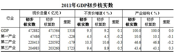 經(jīng)初步核實,2011年國內生產(chǎn)總值現(xiàn)價總量為472882億元,比初步核算數(shù)增加1318億元,按不變價格計算的增長速度為9.3%,比初步核算數(shù)提高0.1個百分點。其中,第一產(chǎn)業(yè)增加值為47486億元,比初步核算數(shù)減少226億元,增長速度為4.3%,比初步核算降低0.2個百分點。第二產(chǎn)業(yè)增加值為220413億元,比初步核算數(shù)減少179億元,增長速度為10.3%,比初步核算數(shù)降低0.3個百分點。第三產(chǎn)業(yè)增加值為204983億元,比初步核算數(shù)增加1723億元,增長速度為9.4%,比初步核算數(shù)提高0.5個百分點。按初步核實數(shù)計算的三次產(chǎn)業(yè)結構,第一產(chǎn)業(yè)占10.0%,第二產(chǎn)業(yè)占46.6%,第三產(chǎn)業(yè)占43.4%。
