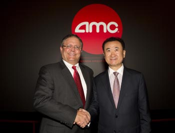 9月4日,萬(wàn)達(dá)集團(tuán)董事長(zhǎng)王健林(右)與AMC首席執(zhí)行官和董事長(zhǎng)杰里·洛佩斯在美國(guó)西洛杉磯一家AMC影院出席新聞發(fā)布會(huì)。中國(guó)大連萬(wàn)達(dá)集團(tuán)當(dāng)天宣布,已經(jīng)完成對(duì)美國(guó)第二大院線集團(tuán)AMC娛樂(lè)控股公司總計(jì)26億美元的收購(gòu),萬(wàn)達(dá)將成為全世界規(guī)模最大的影院運(yùn)營(yíng)商。