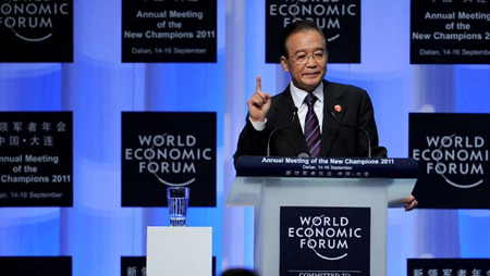 2012夏季達沃斯論壇于2012年9月11日至13日在天津市梅江會展中心舉行,國務院總理溫家寶將出席開幕式并發(fā)表主題致辭,預計全球將有超過2000名政要以及各行業(yè)精英將出席本屆論壇。圖為2011年9月14日第五屆夏季達沃斯論壇在大連舉行時,溫家寶總理出席開幕式并做致辭。