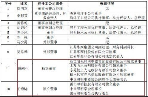 海洋王招股書顯示,在公司高管兼職情況表中,獨(dú)立董事陳燕生身兼五家上市公司獨(dú)董,以及獨(dú)董王錦燧在海洋王照明和雷士照明兩家競(jìng)爭(zhēng)對(duì)手公司同時(shí)兼職,引起投資者關(guān)注。
